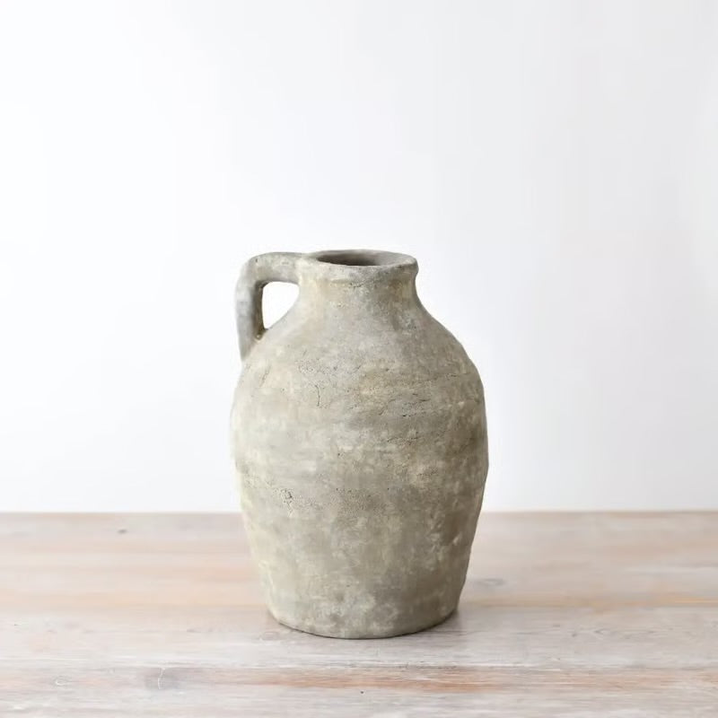 Ein rustikaler großer Krug aus Terrakotta mit einer strukturierten Oberfläche in einer schicken neutralen Farbe.