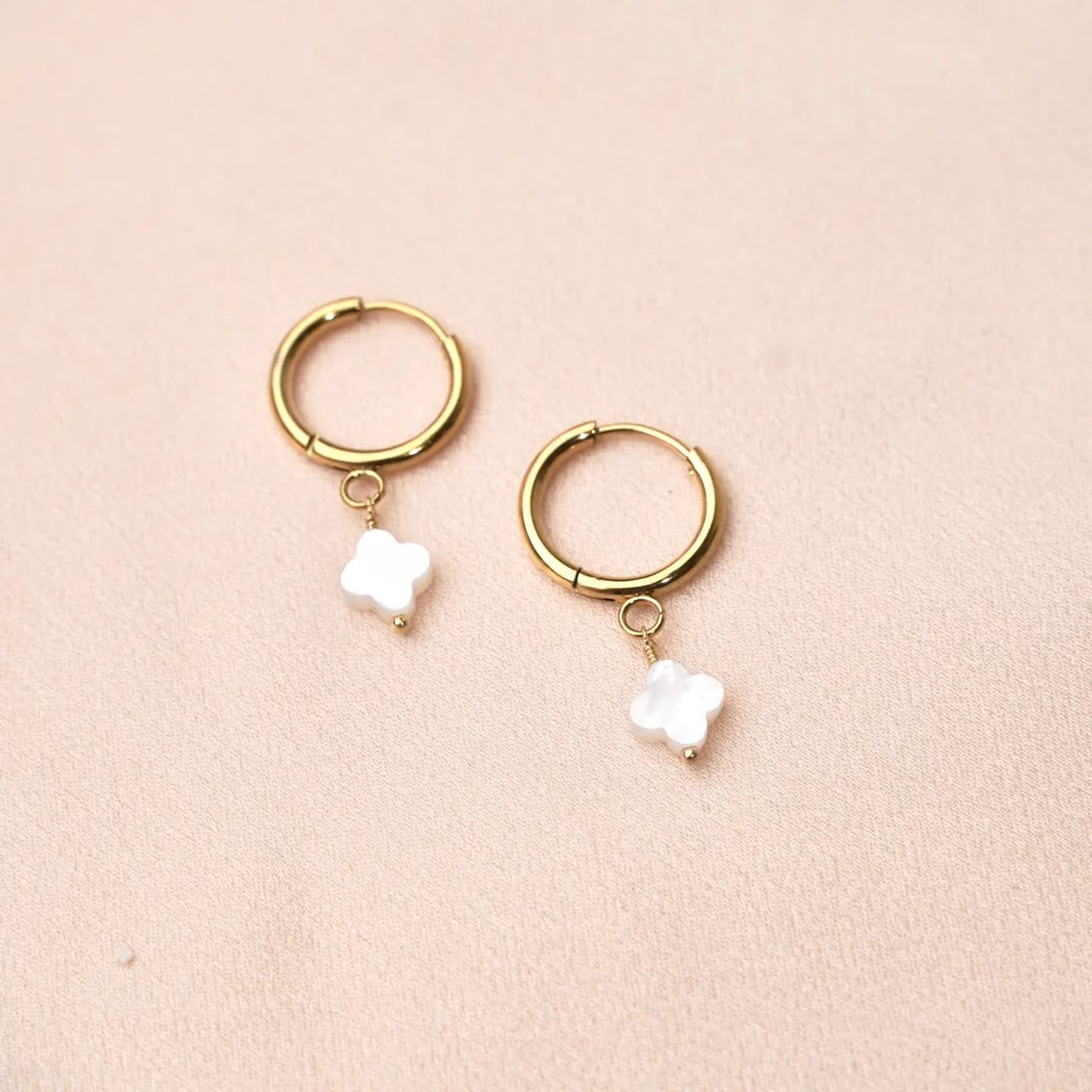 Diese schönen Mini-Creolen aus Edelstahl sind perfekt für jeden Anlass, Tag oder Nacht. Sie haben einen kleinen Perlmuttanhänger in Form eines Kleeblatts.